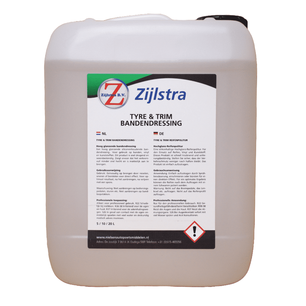 Tyre ’n trim, vinyl is een hoog glanzende siliconenhoudende bandendressing. Voor gebruik op banden, vinyl en kunststoffen. Dit product is snel drogend en weerbestendig. Zorgt ervoor dat het verkeersvuil minder snel hecht en is makkelijk aan te brengen.